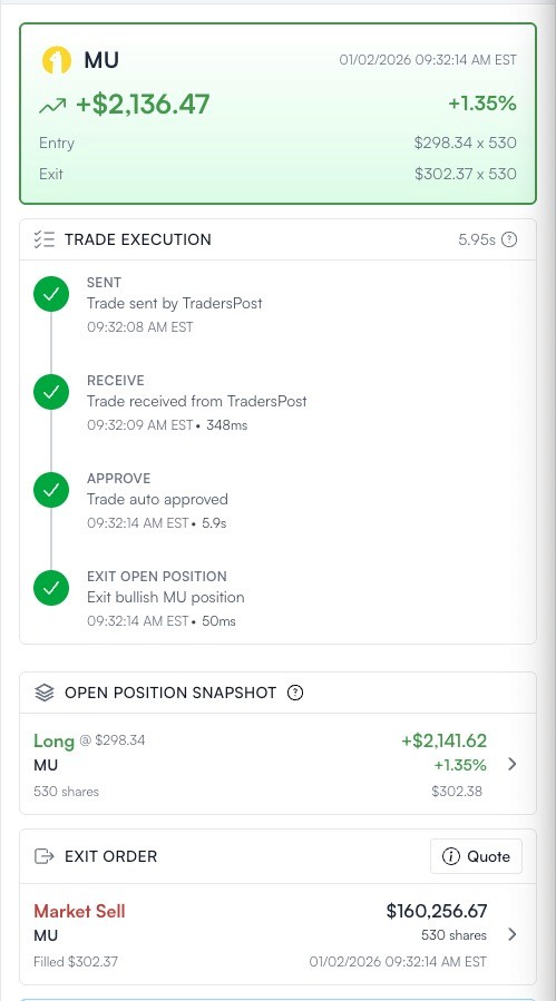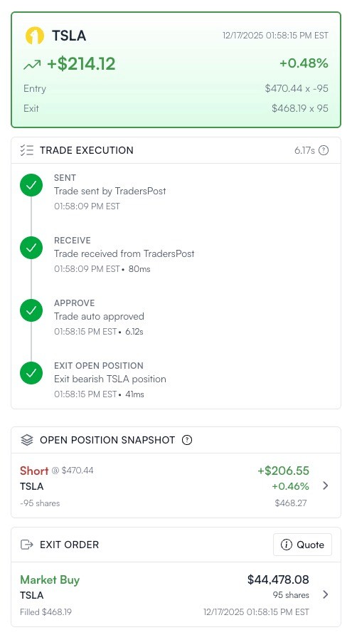 Approved trades instantly copy to your account. Typical hold time: under 30 minutes. All positions close before market close zero overnight risk.